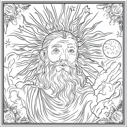 A kind and gentle figure of God creating a sun with a friendly face and a moon with a peaceful expression, both in the sky, with a clear division between day and night, which God is pointing at with one hand, simple and bold lines, no gray tones, black and white only, for a coloring page, children 4 to 10
