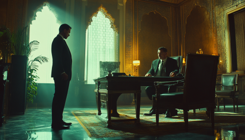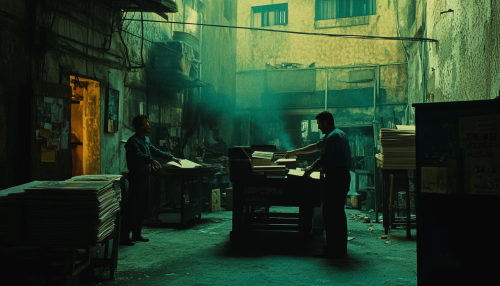 middle eastern neighborhood, a police detective shouting at on woman and two men working in a paper printing warehouse, david fincher movie, cinematic shot ,day, dark green and orange color palette --ar 7:4 --v 6.1