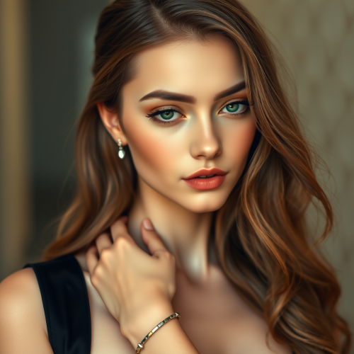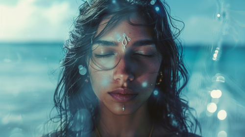 photorealistic image of a beautiful woman, aged 35-40. The image is taken at the siddharth ocean front resort and spa. Mystical, lemurian vibes, 4k --ar 16:9
