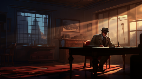 a side view of an agry detective interrogating an empty space in front of his desk, wide angle, --ar 16:9