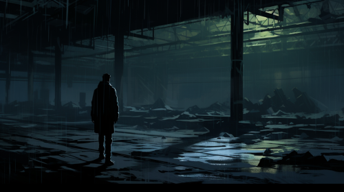 Enigmatic Pursuit, A Chilling Chase An abandoned factory at twilight, its rusty beams and shattered windows echoing the decay of a forgotten era. Our protagonist, a lone detective, stands amidst ominous shadows, gripping a cryptic journal. Faint whispers of secrets linger in the air, as a chilling mist blankets the scene. The atmosphere is laden with suspense, a palpable tension that makes the heart race. Dim, flickering industrial lights cast eerie glows and menacing shadows, emphasizing the detective's relentless pursuit. The light's dull, sepia hues create a haunting ambiance, where mysteries unravel in the obscurity of the past. --ar 16:9 --c 15