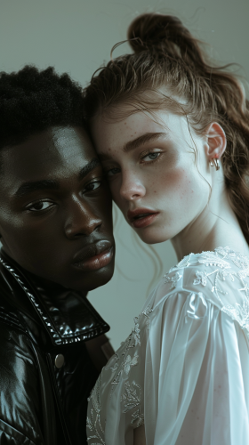 Fashion photography of a young black man and a white young woman in a cinematic style, creating a narrative scene that looks like a still from a movie, with dramatic lighting and a compelling backdrop --v 6.0 --stylize 150 --style raw --ar 9:16
