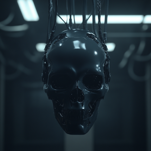 3D render front view of matte black cyborg skull head, kept floating by si fi cables coming from above, dark poorly lit sci fi medical station background, light only from the ceiling, octane render, 4k details
