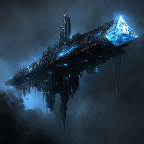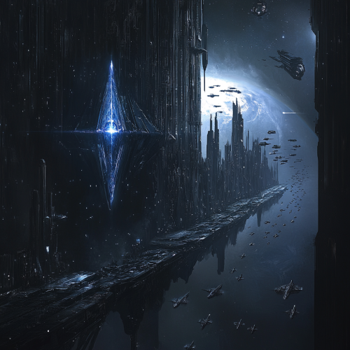 A Dark and gritty sci fi space station with floating in a space devoid of light or colour, with many small space ships flying towards it, in the background there is a large sci fi space ship that belongs to the authorities. The Space station is long with the highest parts being a bright blue diamond shape and the remainder of its body becomming more industrial and broken