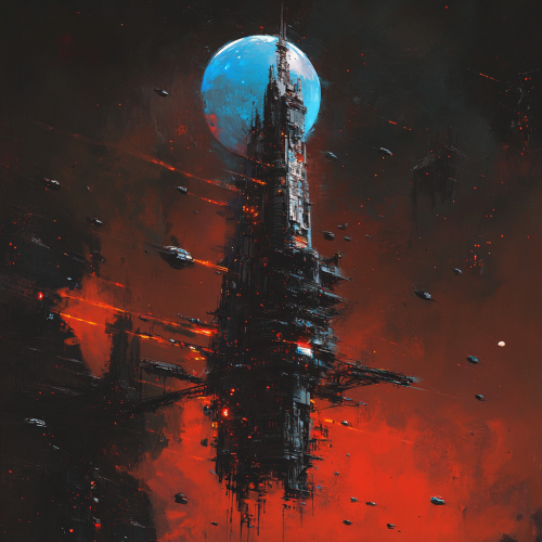 A Dark and gritty sci fi space station with floating in a space with many dark and muted colors in the background within the red spectrum, the space station is tall with the highest parts being a bright blue bubble shape and the remainder of its body becoming more industrial, broken. Near the bottom of the space station there is a lot of debris and heavy rusting can be seen