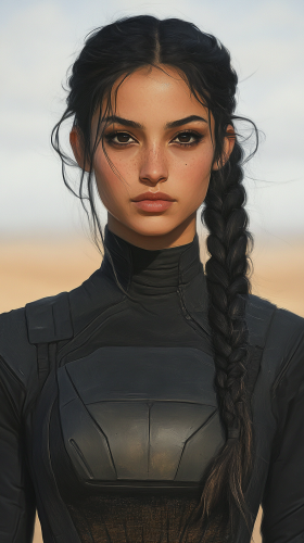 20 years old tanned skin persian female portrait, dark black braid hair, black eyes, front view, wearing fedaykin suit, dune fedaykin, desert planet Arrakis. sci-fi, hyper-realism. detailed, subsurface scattering, dark sci-fi character concept art, by Jeremy Mann, Anna Dittmann, magali villeneuve, Childe Hassam, Daniel F Gerhartz, Charlie Bowater, Eve Ventrue, Fernanda Suarez --ar 9:16 --v 6.1