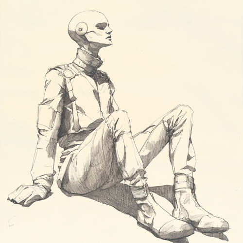 Illustrate a figure seated in a poised and confident posture, wearing a sleek, fitted outfit that gives a vintage sci-fi feel, inspired by Edward Gorey’s style. The character should have a neutral, detached expression, conveying an air of calm mystery. Use intricate cross-hatching to create texture and shadow on the outfit and boots, enhancing the sense of depth and realism. The background should be minimalistic, with soft hints of light and shadow to create an isolated, almost surreal atmosphere. Incorporate symbolic elements, such as a small, abstract shape or an unusual item in the background, to add a subtle layer of intrigue and tension.