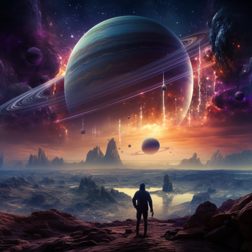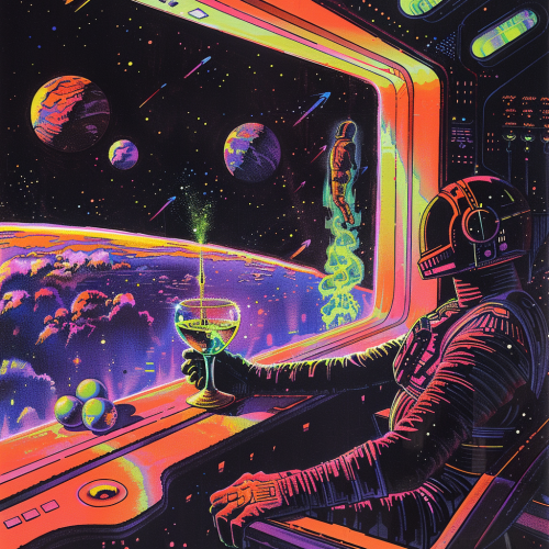 1980s Sci-Fi Art Style, detailed illustration, high contrast: A hero at a space station lounge, sipping a bubbling, iridescent cocktail with floating glow-in-the-dark fruit, overlooking a nebula through a large window.