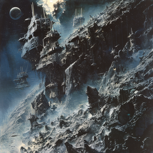 1980s Sci-Fi Art Style, detailed illustration, high contrast: The Asteroid of the Damned, a floating graveyard of ships entangled in the twisted metal and rock, shrouded in a ghostly light and shadow.
