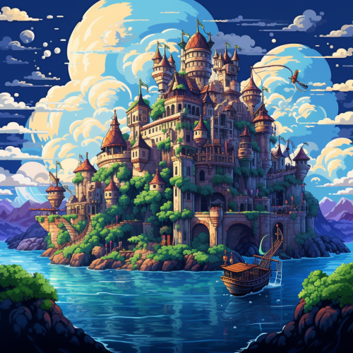 A beautiful castle courtyard on an island made of wooden rafts and ships, coral motiff, scifi, raft, sea ship, midnight blue skies, bright sun, tritons, d&d, retro, cozy, bubbles, pixel art style