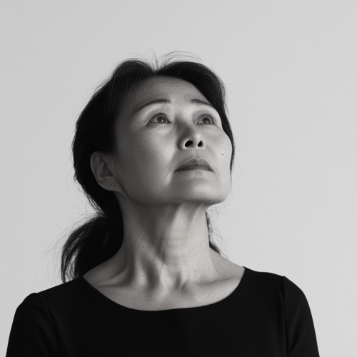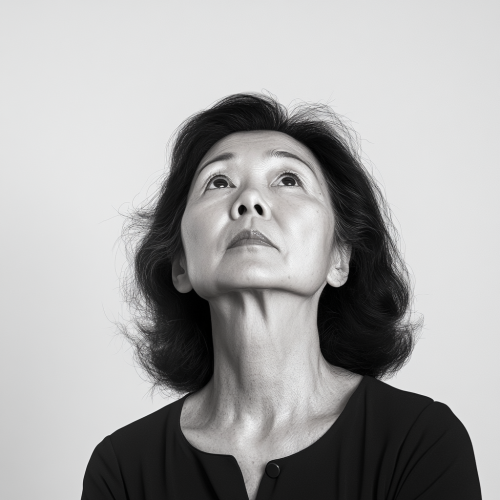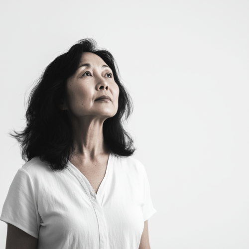 a 59 year old asian woman standing on a seamless white background looking off into the distance hopeful and confident black and white photorealistic nikon 4K