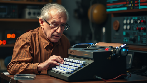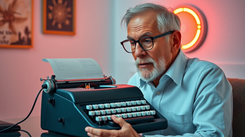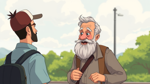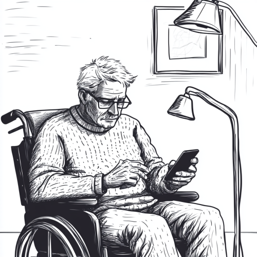 A 60 year old ethnically vague man with mostly white hair sitting in a wheelchair at home wearing a cozy sweater answering yes and no questions on his smartphone, illustrated in a minimal black line art style with varying brush stroke widths, and lots of white space.