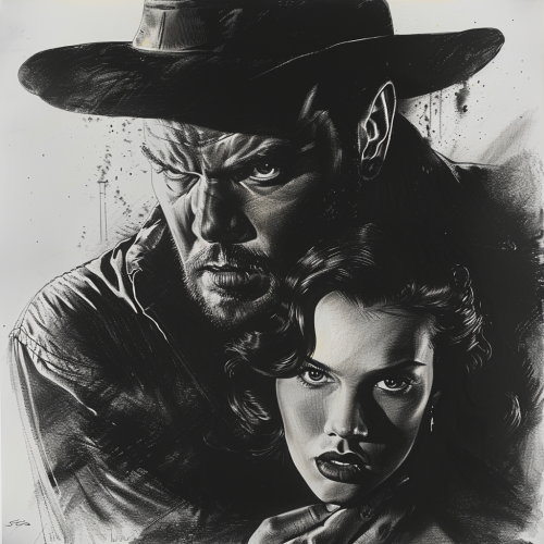 A charcoal drawing of Orson Welles as a menacing man in large fedora hat who might be a vampire, beautiful woman hanging on to him dramatically, noir style, black and white, semi-realistic, from the radio show The Shadow --s 250 --v 6.0 --style raw