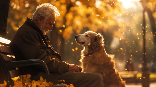 imaging ultra photorealistic 8k imgae showcasing a close-up of the old man sitting on a park bench, gently petting his aging dog, who rests his head on the man's lap. The sunlight filters through the trees, creating a warm but bittersweet atmosphere --ar 16:9 --stylize 200