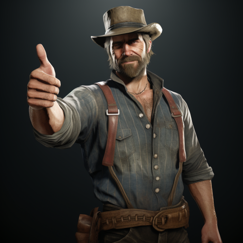 red dead redemption character, 40 year old amish man, wearing a straw hat with green & white ribbon around it, blonde hair, brown full bread, blue eyes, blue denim shirt, sleeve rolled up, a red handkerchief around the neck. posing and smiling for a camera using his right hand to give the thumbs up