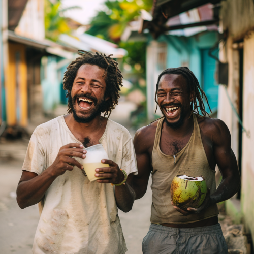 black rasta man and caucasian friend standing and sipping on coconuts while laughing, on small village street in Antigua, shot on Arri Alexa, 50 mm Sigma prime lens, shallow depth of field