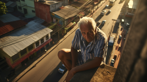 Cinematography action shot, BrasÃlia street, old man, high angle view , Photography, Photojournalism, Natural Lighting --ar 16:9