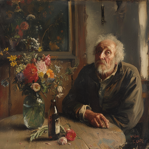 flowers in vase in foreground, old man alone at table in background all in focus, by John Constable --video