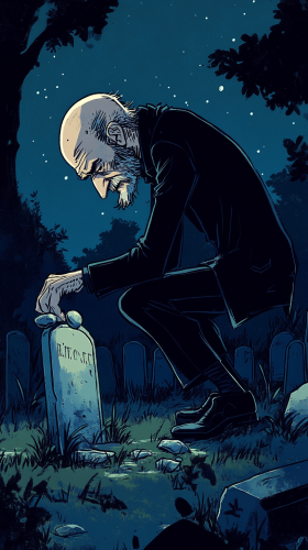 This is a cartoon-style depiction of a balding, goateed old man, dressed in black pants and jacket, crouching in a graveyard at night, placing a few stones on the headstone he is facing. --ar 9:16
