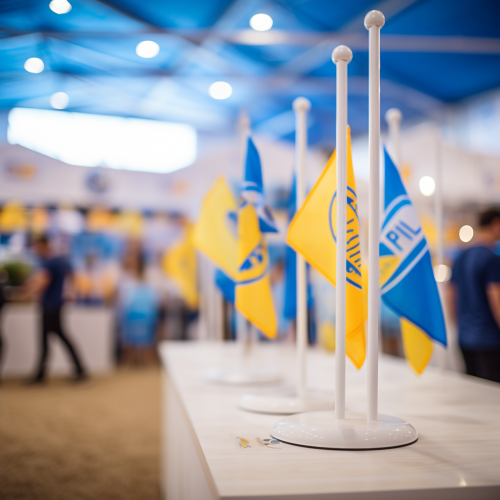 photo at convention with display products, yellow, blue and white beach flags, roll-ups, banners, display tents, with sport team logos, sport team themed out of focus in the background, depth of field