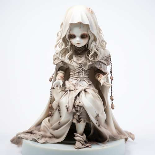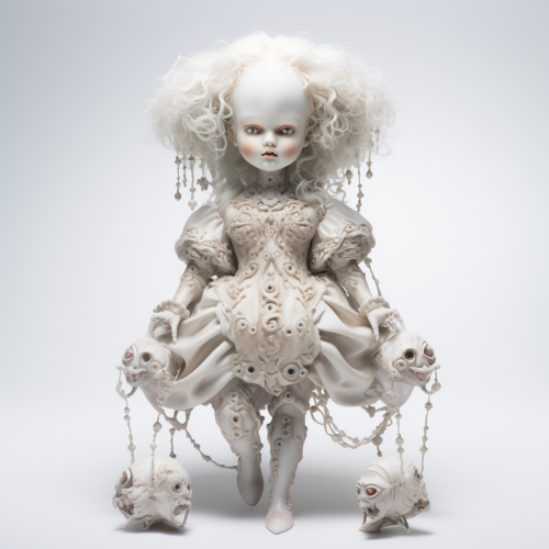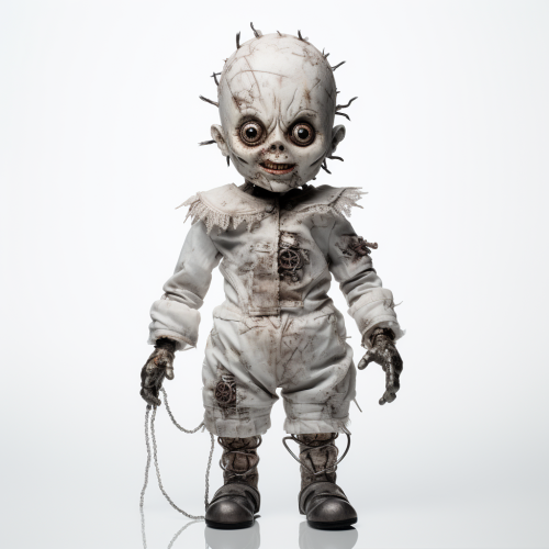 product photography of a cursed porcelain doll on an all white background, product display, 3D shading, universal lighting, unreal engine, photo realistic, ultra realistic, detailed, in the style of dungeons and dragons, fantasy art aesthetic, in the style of mystic mechanisms, gradient packaging