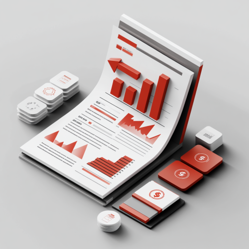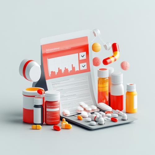 Create a 3D illustration of an open price list with a highlighted section showing price increases, accompanied by medical products. Use company colors: red and gray