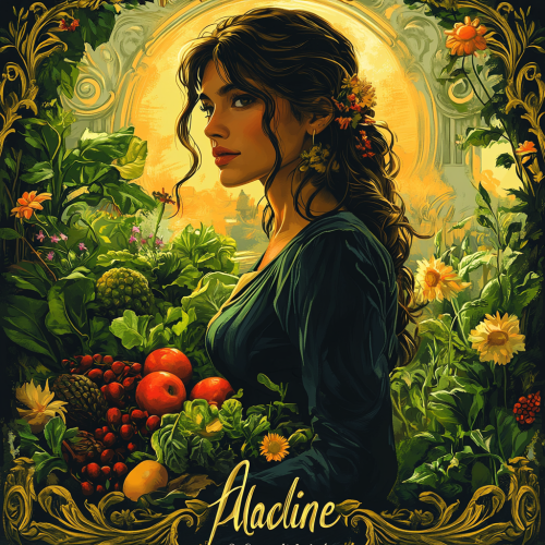 Create a visually stunning Art Nouveau-inspired alcaline food list poster featuring a sinuous, nature-themed design. Incorporate intricate, flowing lines and ornate details. Use soft, pastel colors and depict a harmonious blend of organic elements like vegtebales, fruits, seeds, nuts and flowers, and elegant female indigenous figures. –v 5.2 –ar 16:9 –stylize 900 --s 750 --style raw