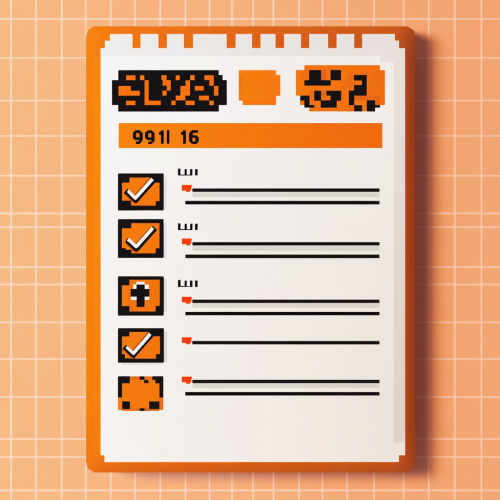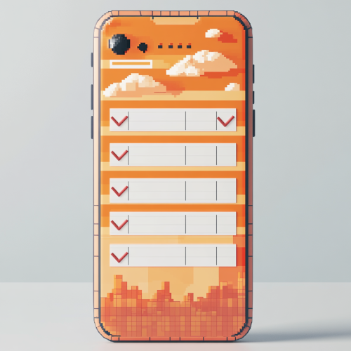 Design a phone-sized task list template with a vibrant 8-bit, retro video game aesthetic. The list should have clear, blocky checkboxes or scratch-off sections next to each task. Use a bold, pixelated font for the text. The template should primarily use orange and white as the main colors, with a pixelated background featuring subtle videogame elements, like power-ups, coins, or hearts. Ensure the layout is vertical, optimized for mobile screens, with each task taking up its own line. Give the interface a fun, arcade-like feel, reminiscent of classic 80s/90s games.