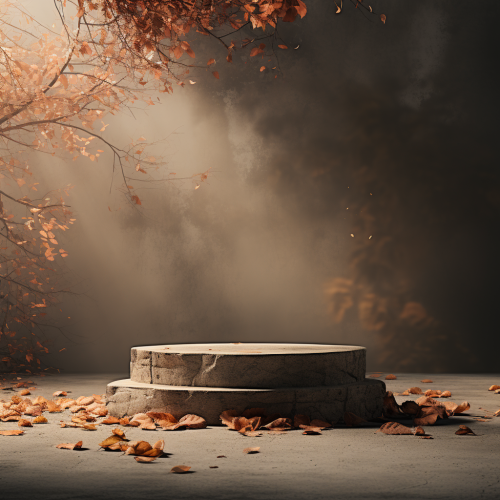 create an empty base pedestal, minimal, photographic image for a commercial product display, modern style scene, nature of leaves and some colors, surreal background with mid-afternoon light behind, more nature, artistic , avant-garde background --s 250