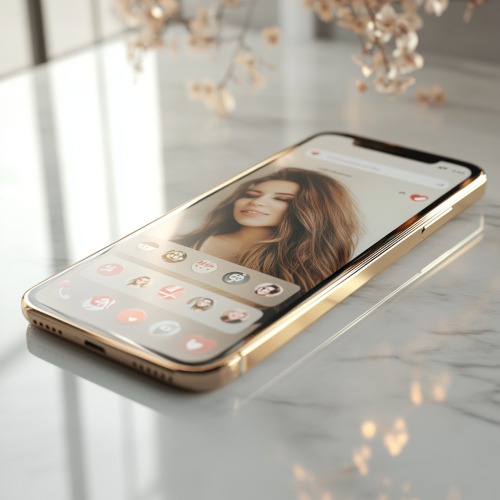 ––ar9:16 Ultra-realistic image of a modern smartphone in a clean, professional setting, photographed in the style of a Fujifilm camera for rich detail and true-to-life colors. The smartphone screen subtly displays a dating app interface with blurred profile icons and familiar dating app icons, ensuring a discreet, polished look. The background is minimalistic, softly lit with a sleek, modern vibe, featuring neutral tones to keep the focus on the smartphone. Captured with a shallow depth of field to enhance photorealism, with an aspect ratio of 9:16, emphasizing the smartphone as the focal point.