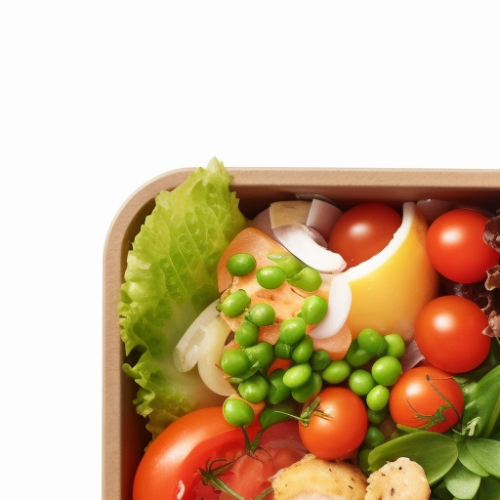 https://s.mj.run/biOO3NmofBI Rectangular Paper box filled with lettuce leafs, grilled pieces of baked potatoes sliced, three cherry tomatoes, green pease, small pieces of carrots, sliced radish, small pieces of grilled chicken breast, white dressing, ultra realistic, photorealistic, 2d top view, 4k --iw 2.0