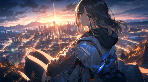 anime style girl with a light jacket, ponytail hairstyle with her back towards the viewer sitting on the edge of a high rise chilling watching the sun rise over a sprawling cityscape with vibrant lights and neonsigns, medium-angle shot, anime, vibrant colors --ar 16:9 --niji 5 --seed 0 --s 950