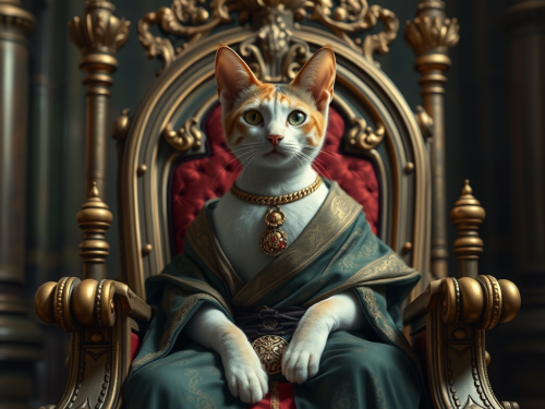 a goldifsh sitting on a throne with a crown on its head. it points directly at the camera