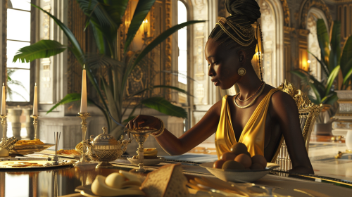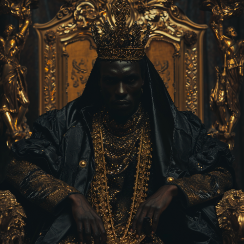 a caramel tone king in a royal throne in a golden jeweled crown and dressed in black and gold --v 6.0