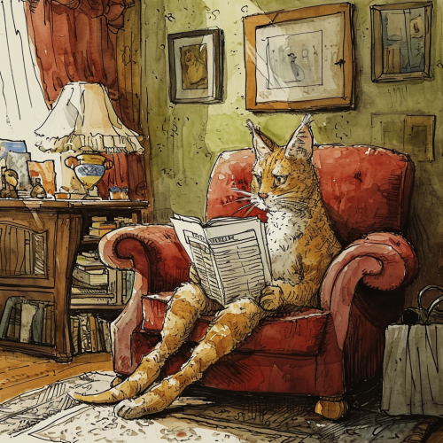 exaggerated smiling Cheshire cat reading a book, Alice in Wonderland inspired character, three-quarter view, full body, simple features and harmonious colors, harmonious brushstrokes, isolated at white background. --v 6.0 --stylize 750