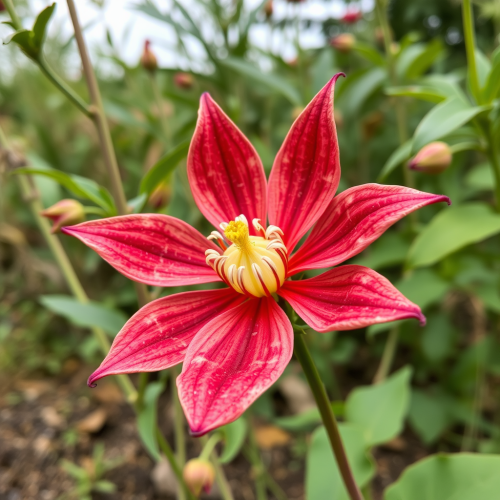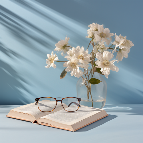 A 3D flower and a real flower close - up, in a vase, woman reading glasses, a sunny environment, a simple and intriguing composition, light blue wall, soft colors, the best image quality, overhead shot.