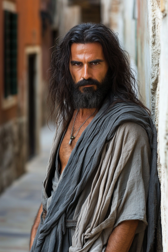 Male earth wizard in 1221 Venice, full length view, stands at 152 cm weighing no more than 52 kg, with a lean, compact builg. His dark hair is worn long, often tied back, a neatly trimmed beard, lending him a scholarly appearance. His skin, lightly weathered from travels across Italy, bears the sun-kissed tones common among Venetians. Dressed simply, he favors well-made robes in muted tones--stone grey, moss green, and ochre. Eyes are a deep, earthy brown with subtle flecks of ochre, lending an intensity to his gaze. Camera: DSLR - Canon EOS 5D Mark IV. Lens: Canon EF 24-70mm f/2.8L II USM. Composition: Wide shot, room-centered, horizontal orientation, balance between furniture and space. Film: Digital, high resolution, color profile sRGB. Camera settings: ISO 400, f/2.8, 1/60 sec. --ar 2:3 --v 6.1 --s 250