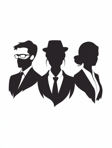a simple vector illustration of implicitly describe scholar and expert figures (add a woman) with a monochrome background and white space around the whole design. --ar 3:4