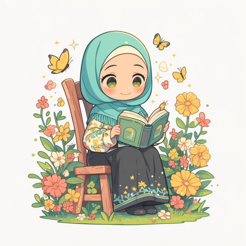 2d anime cartoon teenage girl wearing hijab ,sitting on chair,reading book in the garden,have flower. bird,butterfly around her --s 750 --niji 6