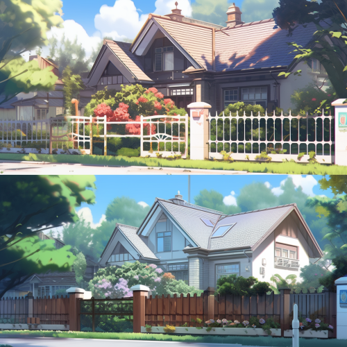 The surroundings look like the front of the house, the garage on the left, the flower garden in the yard which is neatly arranged, the front fence of the house protecting the flower garden, the house surrounded by trees, Disney animation style --niji 5