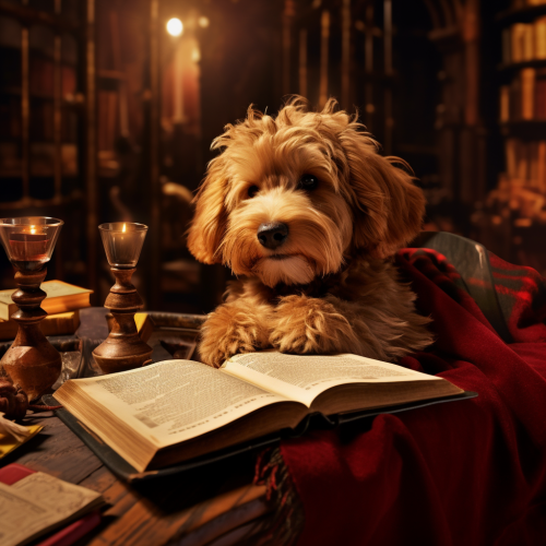 golden doodle reading a book in grand Gryffindor house. Fantasy mood, Harry Potter glasses on dog. Photorealistic.