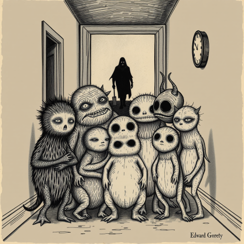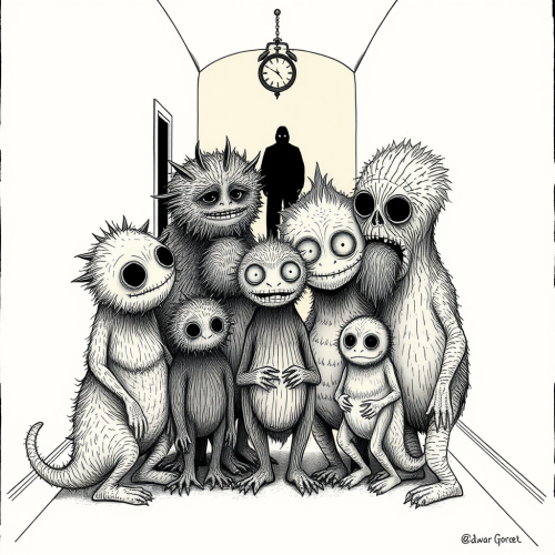 illustration of halloween monsters watching a scary movie at the cinema, using less than four colors, pastel muted colours, negative space, Maira kalman illustration style, white background
