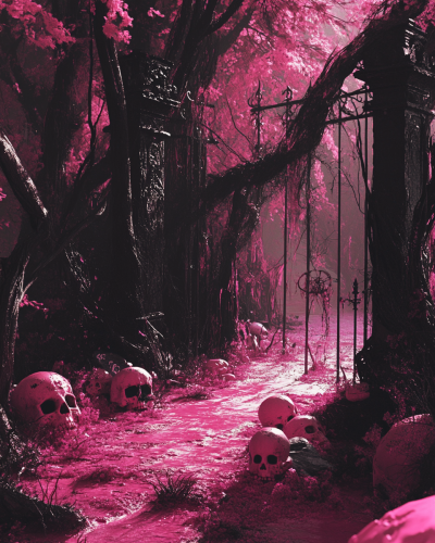 a hot pink forest with a creepy, eerie aesthetic. there are skulls & jack-o-lanterns on the ground near trees, the trees are black with spiderwebs and hot pink goo dripping from the branches. there is an old metal gate in the forest's entrance with a very haunting vibe. --ar 4:5