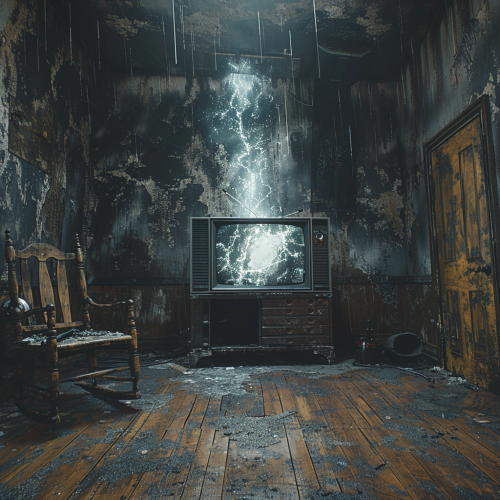 creepy tv turned on showing static in a dark room ominous feeling --s 750 --v 6.0