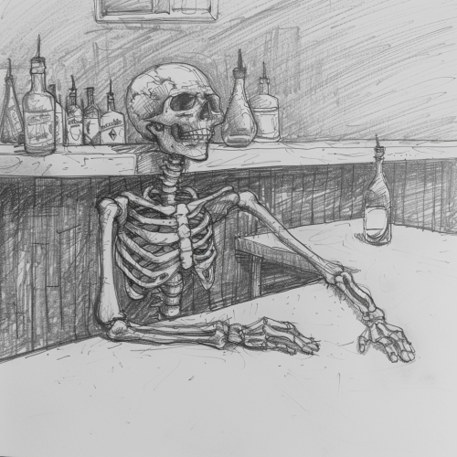 a poorly drawn pencil drawing of a drunk skeleton at an empty bar