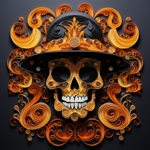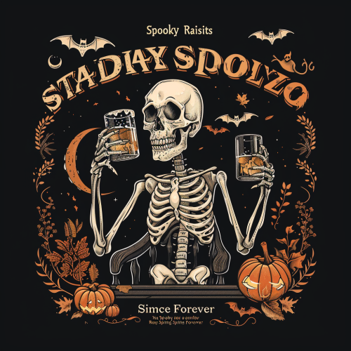 A black T-shirt design with a large, eye-catching design on the front. The centerpiece is a detailed and stylized skeleton, drawn in a slightly cartoonish yet still eerie manner. The skeleton giving off a relaxed, laid-back vibe. In one hand, the skeleton holds up a glass of bourbon, filled with a rich amber liquid that catches the light, reflecting a warm glow. The glass is slightly tilted as if the skeleton is mid-toast, celebrating Halloween with a spooky cheer. The other hand rests on the arm of the chair or perhaps holds a small pumpkin or another Halloween-themed item, like a cigar or a small ghost. Around the skeleton, there are subtle Halloween elements like faint, shadowy bats flying in the background, a crescent moon, and some scattered autumn leaves at the base, giving the scene a seasonal touch. Above the skeleton, in a gothic-style font, the words "Stay Spooky" are arched in a semi-circle. Below, in smaller text, it might say something like "Raising Spirits Since Forever" as a playful nod to the bourbon and the spooky theme. The overall color scheme could include shades of black, white, and gray for the skeleton, with warm tones for the bourbon and subtle pops of orange or red for the leaves and other details. The design balances a sense of fun with just the right amount of Halloween spookiness, making it a perfect shirt for the season. --v 6.0