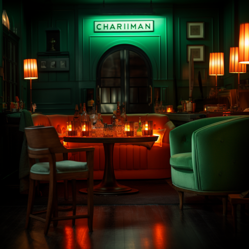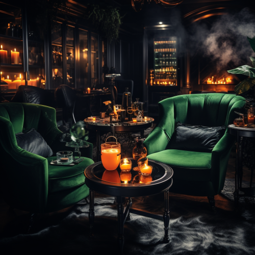 photograph of a spooky Halloween speakeasy, simple luxury, appealing interior design, colorful glowing drinks on a table, a hallway off to the side with a slight green glow, cinematic lighting, a few candles, decor, spooky lighting, octane engine, --no webs or skulls