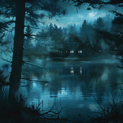 Black and White logo, ocean, shadow, coast, haunted, trees, spooky, intriguing, vector, frightening