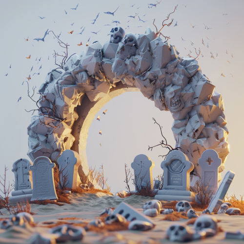 a 3D render of a low poly portal vortex, on the outside crust of the portal there are elements of undead material, bones, tombstones, skulls, symbolizing decay, high quality