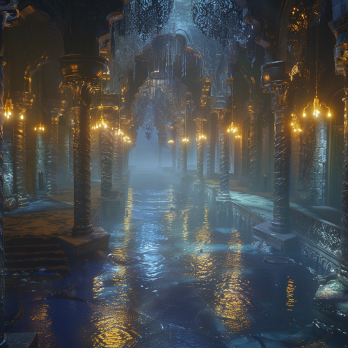 ephell spooky place in a medieval fantasy town,arcades,golden lighting,insanely detailed,intricate,8K UHD,volumetric lighting,blue foggy,Water,shadow of a mysterious men,dark atmosphere --v 6.0